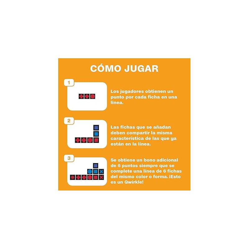 2 a 4 JUGADORES: Qwirkle es un juego de mesa 6 años o más donde podrán jugar de 2 a 4 jugadores, es perfecto para jugar en familia o con amigos y pasar un buen rato. Con estos juegos mesa hay que pensar bien la táctica para conectar los colores y las formas.